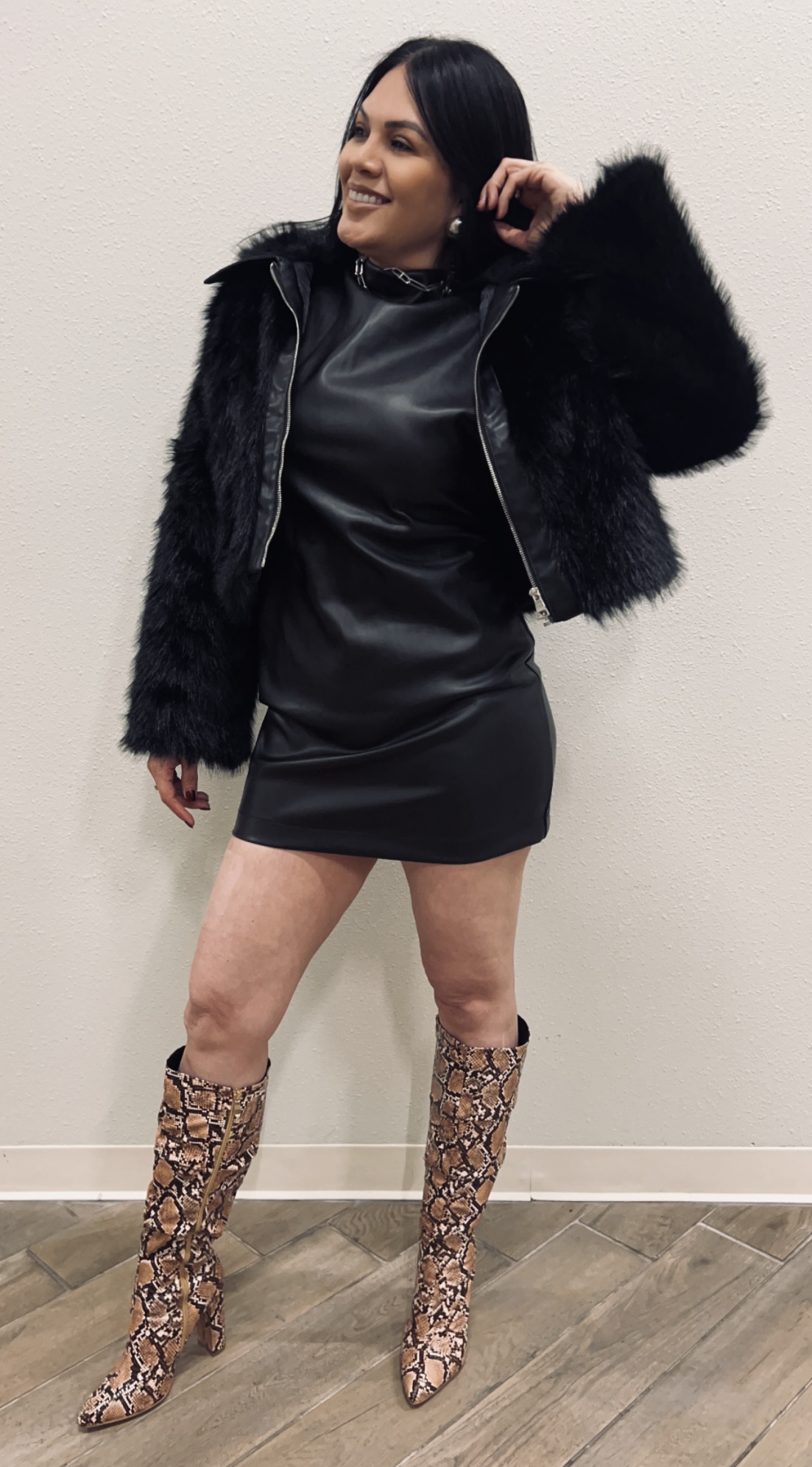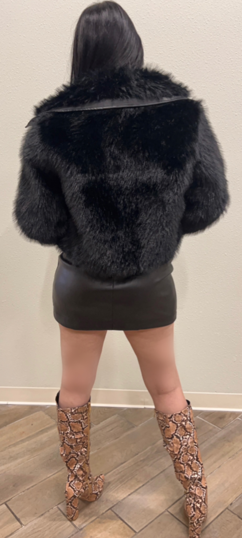 Shop this chic and cozy furry jacket with leather sleek trim for the perfect blend of style and comfort for cold days.
